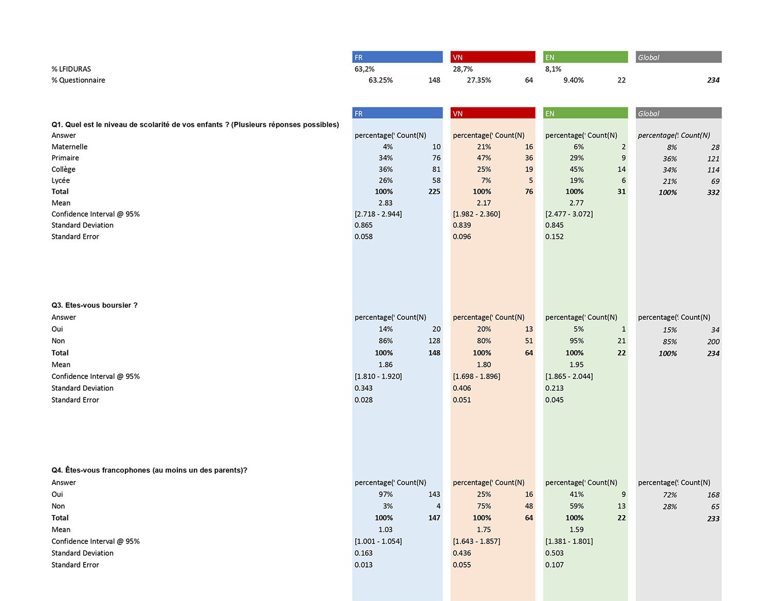 - Structure des répondants : 63% FR / 29% VN / 8% nationalités tierces. (ce qui reflète assez fidèlement les proportions de la composition des familles du Lfiduras.