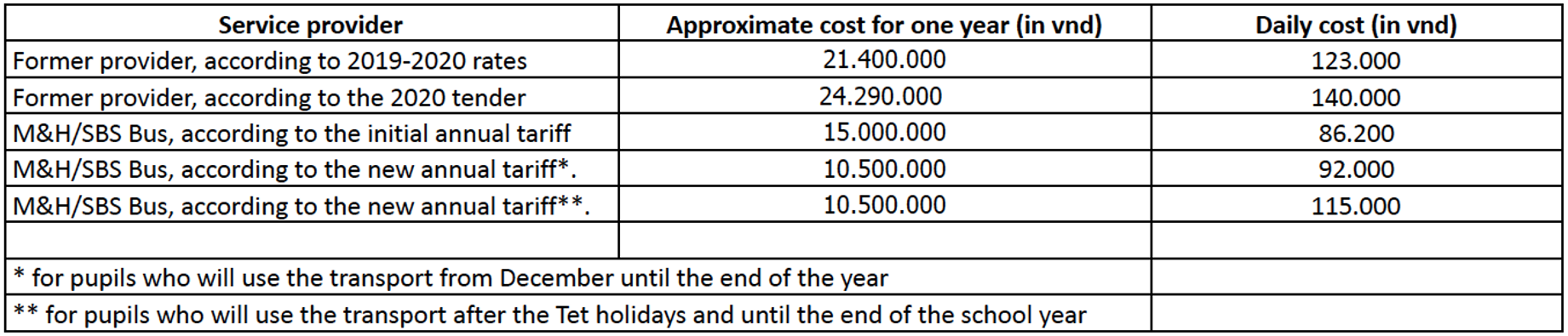 SBS told us that “it has researched all possible solutions and that only a single annual fee of 10,500,000 VND/child for the rest of the school year would allow them to save the activity and continue running the service under good conditions. From now on, this single fare is applied to all those who take the bus since the last week of December as well as for those who should be able to return to school after the Tet holidays”.