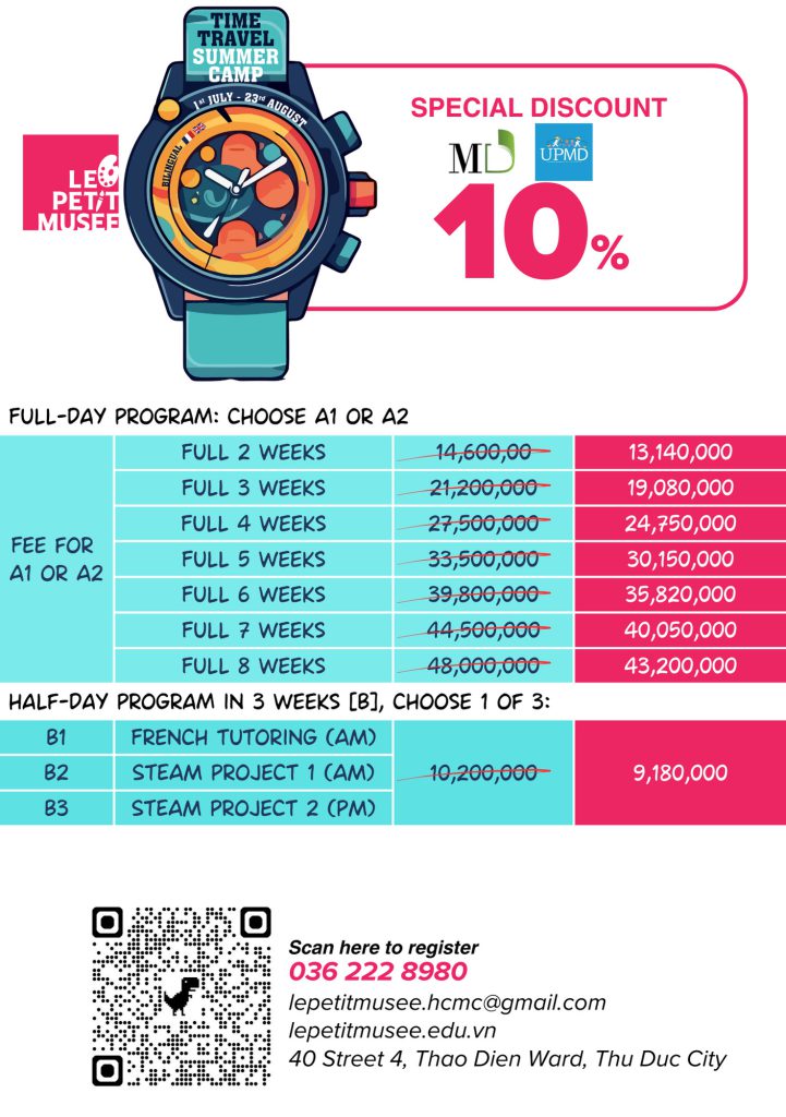 Le Petit Musée is pleased to extend a special discount offer, exclusively for the students of Lycée Marguerite Duras. We are offering a 10% discount on our Summer Camp 2024 program with a minimum registration of 2 weeks.