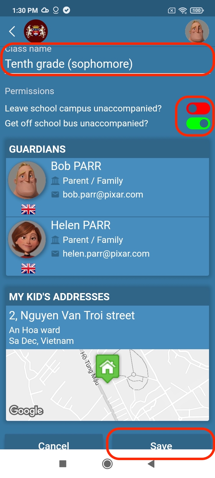 Pensez à mettre à jour leur classe et les autorisations pour que votre enfant puisse sortir seul de l’école ou descendre seul du bus scolaire. N’oubliez pas d’appuyer sur le bouton Save pour enregistrer vos modifications (cf. écran 4).