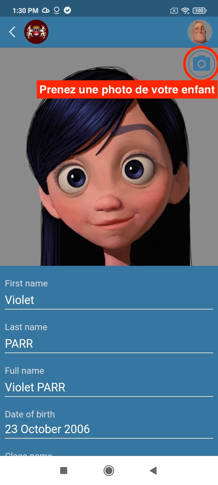 - Dans l’écran de l’un de vos enfants, appuyez sur l’icône de l’appareil photographique en haut à droite (cf. écran 5).