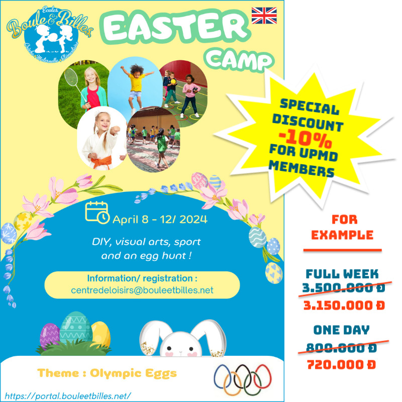Trong kỳ nghỉ lễ Phục sinh, trường Boule et Billes mở cửa hoạt động từ ngày 8 đến ngày 12 tháng 4 năm 2024 và sẽ chào đón các em từ 3 đến 11 tuổi (từ cấp Mẫu giáo PS đến CM2).